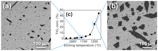 Surface of NBT-Eu ceramics with TiO2 inclusions, thermally treated at 1080 °C (a) and 1200 °C (b), and concentration of TiO2 inclusions as a function of thermal treatment temperature (c).