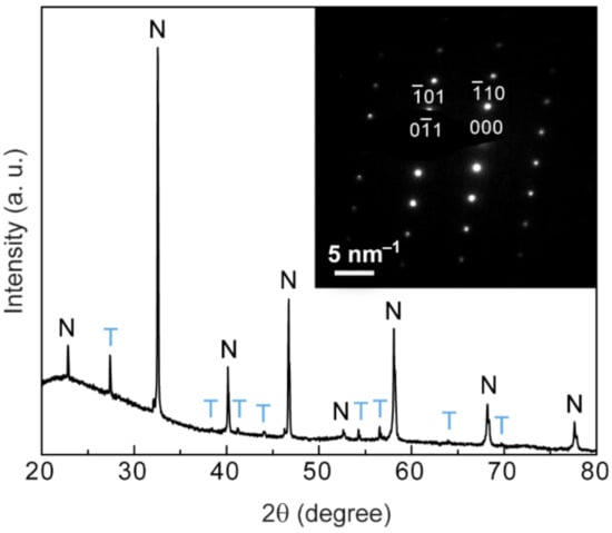 X-ray diffraction pattern of NBT-Eu thermally treated at 1200 °C, where maxima from NBT-Eu (marked with N) and TiO2 of rutile structure (marked with T) are observed. Inset is SAED, obtained from an NBT-Eu lamella containing a TiO2 inclusion and cut from the non-treated sample (the diffraction maxima are indexed according to the rutile structure along the [111] zone axis).