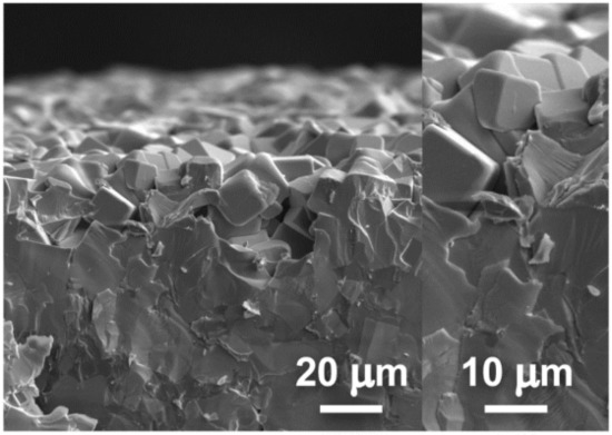Of course, we cannot exclude the existence of other methods, even accidental, of obtaining the microstructure of the third type (observed in thermal treatment temperature Region III). The term “microstructure of ceramics” is not applicable in this case, even in general assumptions, if dense ceramics are considered. The absence of a more or less flat surface with grain boundaries and a remarkable concentration of empty spaces between the faces of grains clearly reveals a loose structure (such cubic-shaped grains, oriented in various directions, cannot create dense packing also in general assumptions), while the fraction of the small grains is significantly reduced compared with the bulk of the ceramics. The non-compliance of such a micrograph with the actual microstructure follows not only from the comparison of grain size distribution (Figure 2b,c). It can be clearly demonstrated also visually, when considering the microstructure of a cross section (fracture) of the thermally treated sample. As can be seen from Figure 7, only the thermally treated surface has the specific microstructure of the third type, while, beneath the surface layer, the ceramic is dense.