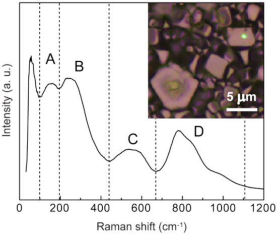 The micrographs belonging to the third type can be valuable, even though they do not represent the real microstructure and are not appropriate for the characterisation of the microstructure. First of all, they clearly reveal very symmetric natural faces of NBT-Eu grains, which allows one to explain the grain growth mechanism in NBT-based ceramics [3]. They also indicate that individual grains in NBT-Eu ceramics are single crystals of a simple symmetry. In addition, sometimes they can be used to study the properties of appropriately oriented single crystals. As an example, we performed micro-Raman investigation for a single grain oriented in the [100] direction of the ceramics thermally treated at 1240 °C (inset in Figure 8). The obtained spectrum is presented in Figure 8. Its specific character is additional evidence of the fact that crystals, which grow on the surface of the sample in heavy thermal treatment conditions, are pure NBT-Eu. Four broad bands in the ranges of 100–150 cm−1, around 250 cm−1, 500–600 cm−1, and around 800 cm−1 correspond to the well-known Raman spectrum in NBT [27].