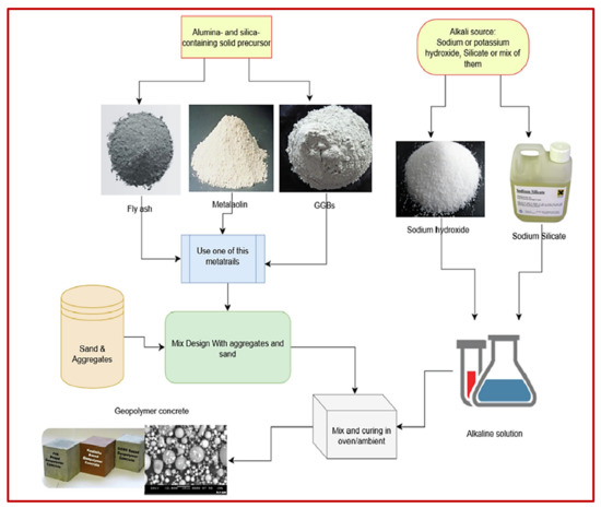 GPC is a potential green construction material that is also cost-effective. The by-products of the polymerization processes are known as geopolymers involving alkali activators and aluminosilicate-rich materials. The raw ingredients used in this process come from various sources, including metakaolin, GGBFS, and FA. The activators comprise sodium hydroxide (NaOH) and sodium silicate (Na2SiO3). The manufacturing process of GPC is shown in Figure 1. The benefit of GPC is that it replaces conventional cement concrete with industrial effluents, which saves money. The GPC can be produced using industrial waste as raw materials and has significant potential to enhance sustainability [10]. Until now, GGBFS and FA have been used mainly in GPC because of the wide availability of high alumina (Al2O3) and silica (SiO2) [11]. The combining of GGBFS, FA and OPC, is shown in Figure 2 [12]. As a result of the alternative combination options, the characteristics of GPC generated using various binding materials vary. Among the primary reaction products of GPC made using FA/GGBF are sodium aluminosilicate hydrate (N–A–S–H gel), calcium aluminosilicate hydrate (C–A–S–H gel), and calcium silicate hydrate (C–S–H gel), to give a few examples [13].