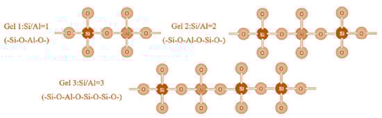 where, w is the quantity of chemical binding water molecules, n is the degree of polycondensation, M is the alkaline metal cation, and z is the ratio (1, 2, or 3) of silicone to aluminum (Si/Al). The structures of the geopolymer are divided into three types according to the Z value: silicon-aluminum (Gel 3, Si/Al = 1), silicon-aluminum (Gel 2, Al = 2), and silicon-aluminum (Gel 1, Si/Al = 3). These structures are shown in Figure 3.