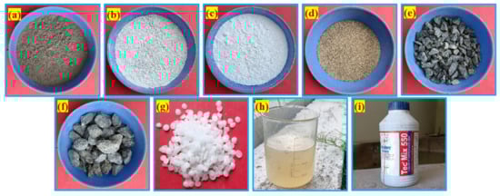 Raw materials used in this research: (a) fly ash, (b) GGBFS, (c) silica fume, (d) fine aggregate, (e) coarse aggregate 12.5 mm, (f) coarse aggregate 20 mm, (g) sodium hydroxide flakes, (h) sodium silicate solution, (i) superplasticizer.