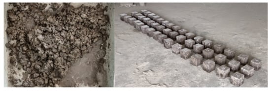 The mixing combination of the FA, GGBFS, SF, fine and coarse aggregate used in this research is shown in Table 5. The selection of these materials and quantities were based on several trials to ensure a compressive strength greater than 30 MPa. The casting procedure for the GPC consisted of the following steps: first, the dry materials including FA, GGBFS, SF, and fine aggregate were mixed for 3 min. Then coarse aggregates were added and allowed to mix for another 3 min. After this process, water, sodium silicate, sodium hydroxide solution, and superplasticizer were mixed thoroughly and added into a dry mixture and mixed for 3 min to achieve a homogeneous mixture. The appearance of the GPC mixture as shown in Figure 5 and the corresponding workability of these mixture were very stiff. The GPC mixture was moulded into a cube of 100 mm in size and vibration was applied to achieve a uniform concrete mixture. The filled moulds were then allowed to cure at room temperature (24 degrees Celsius and 20 percent relative humidity), with the top surface of the mould exposure to the ambient air temperature during the curing procedure. The specimens were demoulded after 24 h, and they were allowed to cure at room temperature until the day of testing (28 days), as shown in Figure 5.
