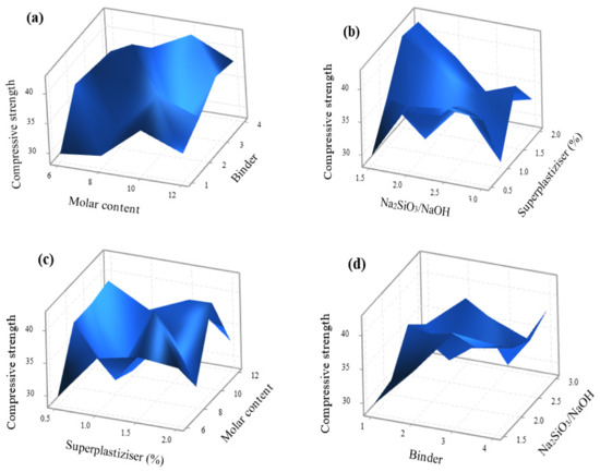 Influence of factors and level on compressive strength (MPa): (a) effect of molar content and binder, (b) effect of superplasticizer and Na2SiO3/NaOH ratio, (c) effect of molar content and superplasticizer, (d) effect of binder and Na2SiO3/NaOH ratio.