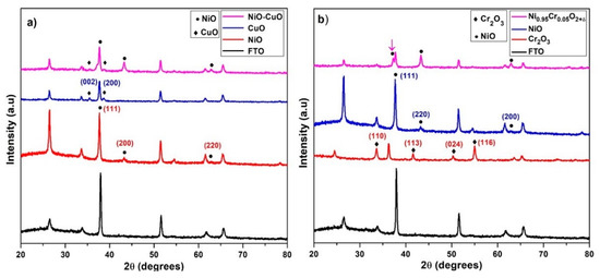 Figure 5a–d presents FESEM images of NiO, CuO, and NiO−CuO thin films (SEM images of bare FTO are added in Supplementary Materials as Figure S1). It is observed in all these SEM images that the substrate surface is evenly coated with dense and well-interconnected nano-particles. Furthermore, in the case of NiO−CuO, several nano-particles appear to be aggregated. The average particle size of NiO, CuO and NiO−CuO is found to be 141.6, 42.6 and 92.1 nm respectively. Figure 5e–g shows the surface morphology of Cr2O3 and Ni0.95Cr0.05O2+δ thin films. SEM images of Cr2O3 and Ni0.95Cr0.05O2+δ display the uniform deposition of irregular nanoparticles, with an average particle size of 14.2 and 77.9 nm respectively. For comparison, the FESEM of pure FTO is incorporated as Figure S1 in the Supplementary Materials. The EDS results of the NiO−CuO thin film reveals a 1:1 atomic ratio of the Ni and Cu elements as-synthesized. The EDS results of the Ni0.95Cr0.05O2+δ thin film also verifies Cr doping in the NiO lattice as the atomic percentage of Cr to Ni is calculated to be 5%. The elemental mapping (Figure S2 in Supplementary Materials) shows uniform distribution of both the metals in NiO−CuO composite thin films.