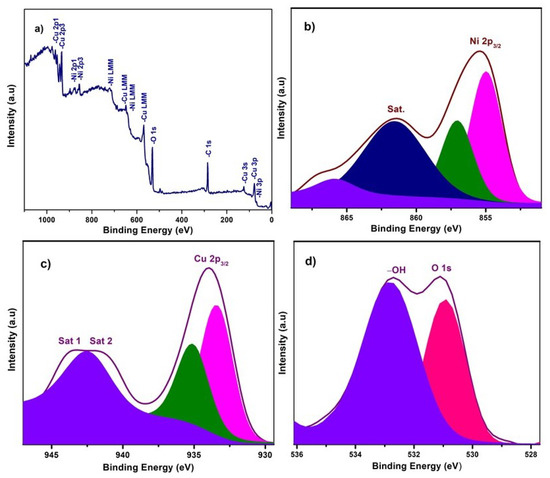 (a) XPS survey scan of NiO−CuO, (b–d) high resolution XPS spectra of Ni 2p3, Cu 2p3 and O 1s, respectively, for NiO−CuO thin film.