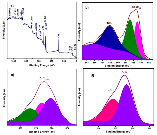 X-ray photoelectron spectroscopy (XPS) experiments were carried out to investigate the chemical composition and chemical bonding state of elements in the NiO−CuO and Ni0.95Cr0.05O2+δ thin films, shown in Figure 3 and Figure 4. In a wide scan XPS spectrum of NiO−CuO (Figure 3a), the presence of strong peaks at binding energies of 285.6, 530.4, 855.2, and 933.6 eV corresponds to C, O, Ni and Cu [37], respectively. Carbon is common in the XPS analysis due to contaminations from both the inside and outside of the vacuum chamber. As shown in Figure 3b, the deconvoluted peaks of the binding energy of 855 and 857 eV belong to Ni 2p3/2, and the satellite peak at 861.6 eV reveals the existence of NiO [38,39]. In Figure 3c, the deconvoluted peaks at 933.9 and 935.134 eV are attributed to Cu 2p3/2, and confirmed by the presence of their satellite peaks at 941.7 and 943.3 eV [32]. The O 1s spectra (Figure 3d) has two distinct peaks at the binding energies of 530.9 and 532.9 eV. The binding energy peak at 530.9 eV corresponds to Ni–O and Cu–O bonds. While the peak at 532.9 eV is a result of the residual water and absorbed oxygen species such as hydroxyl or carbonate species on surface [40]. The wide scan XPS spectrum of Ni0.95Cr0.05O2+δ thin films (Figure 4a) reveals strong peaks at binding energies of 284.9, 531.3, 486.5, 854.5, and 576.9 eV, attributed to C, O, Sn, Ni and Cr respectively. In Figure 4b, a peak is deconvoluted into two peaks with a binding energy of 855 and 857 eV, attributed to Ni 2p3/2, and their satellite peak at 862.2 eV confirms the NiO phase [39]. The XPS spectrum of Cr (Figure 4c) consists of deconvoluted peaks at a binding energy of 576.1, 577.3, and the peak of 578.7 eV reveals the existence of Cr 2p3/2. The signal with the binding energy of 576.1 eV is attributed to spinel oxides comprising Cr (Ni0.95Cr0.05O2+δ) [41]. The O 1s spectra Figure 4d has two distinct peaks at binding energies 530.7 and 532.3 eV, corresponding to the Ni–O, Cr–O bonds and –OH bonds [42] of residual water respectively. These XPS survey spectra of NiO−CuO and Ni0.95Cr0.05O2+δ thin films confirm the presence of their respective elements, which are compatible with the EDX and XRD results.