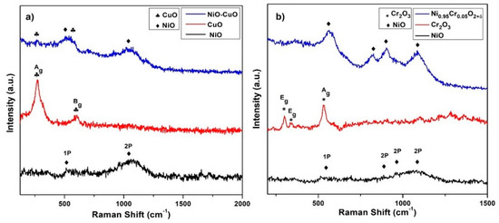 Raman spectra of (a) NiO, CuO, and NiO−CuO (b) NiO, Cr2O3, and Ni0.95Cr0.05O2+δ.