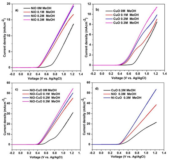 LSV of (a) NiO, (b) CuO, (c) NiO−CuO and (d) comparison of NiO, CuO, and NiO−CuO catalysts at different methanol concentrations in 0.5 M NaOH at a scan rate of 50 mVs−1.