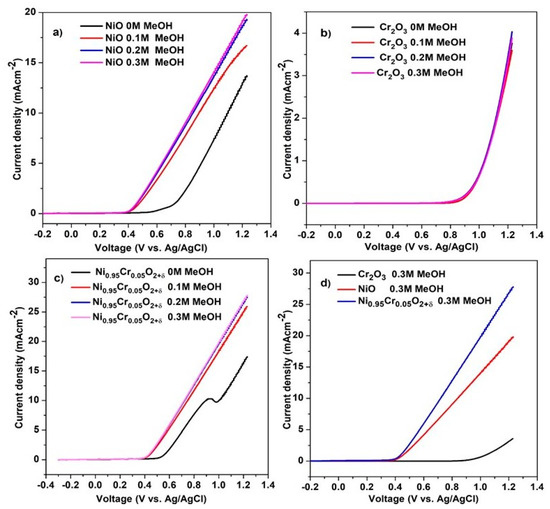 Figure 9a–c shows LSV results of NiO, Cr2O3, and Ni0.95Cr0.05O2+δ thin films at different methanol concentrations in 0.5 M NaOH, recorded at a scan rate of 50 mVs−1. Ni0.95Cr0.05O2+δ shows the onset potential of 0.39 V through the addition of methanol, and that the current produced during the electrooxidation of methanol increased significantly as the concentration of methanol increased. The current density of Ni0.95Cr0.05O2+δ thin film is 6.5 mA·cm−2 vs. 0.6 V in the presence of 0.3 M methanol. The higher current density of Ni0.95Cr0.05O2+δ than NiO and Cr2O3 is due to the combined effect of the Cr and NiO.