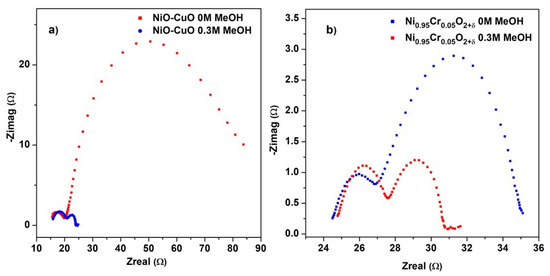 EIS plot of (a) NiO−CuO and (b) Ni0.95Cr0.05O2+δ in 0.5 M NaOH before and after addition of 0.3 M methanol.