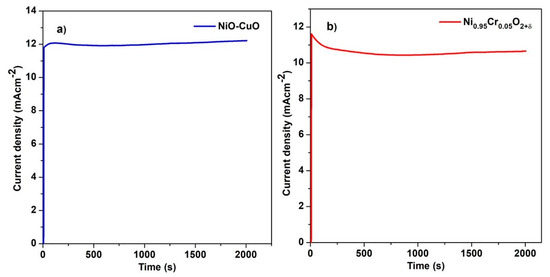 Chronoamperometric graph of (a) NiO−CuO and (b) Ni0.95Cr0.05O2+δ in 0.5 M NaOH and 0.3 M methanol.