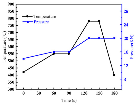 The powders were weighted according to the composition design shown in Table 1. The powders were mechanically mixed in a three-dimensional mixer for 30 min. In the mixing process, about 2% paraffin or kerosene was added to prevent the segregation of the powders and facilitate the press molding of the cutter head. Then, they were put into the Graphite Mold to be sintered in the hot press sintering machine (SMVB60). During the sintering process, the sintering parameters were the highest temperature of 800 °C and the holding time of 60 s. After sintering, the size of samples was 40 mm × 8 mm × 3.2 mm. The specific sintering process was shown in Figure 1.