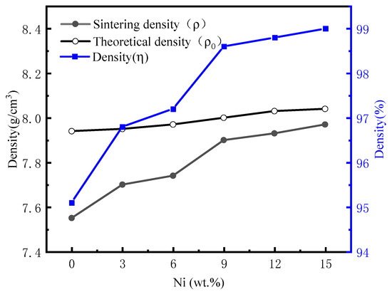 The immersion paraffin method was used to measure the sintering density of samples according to the standards GB/T10451-2002 and GB 3850-83. The sample after being immersed in paraffin at the temperature of 170 °C was weighed in the air and in the water, respectively. The sintering density of samples was calculated by the formulation of , where is the weight of the samples in the air, is the weight of the samples that are immersed in paraffin in the air, is the weight of the samples that are immersed in paraffin in the water and is the density of the water. The theoretical density of samples was calculated according to the formula ), where , represents the mass percentage of each component in the sample and is the theoretical density of each component in the sample. The sample density was calculated by the formulation of .