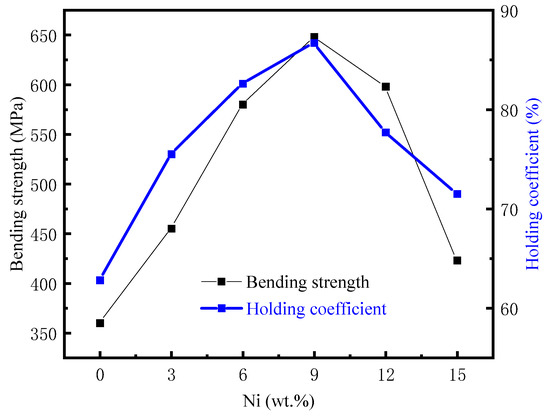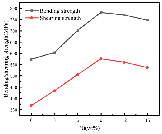 3.2.2. Effect of Ni Content on Shearing Strength and Bending Strength of Matrix