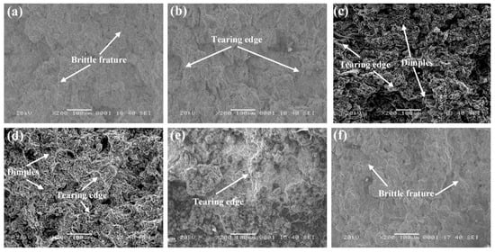 Fracture morphologies of the sintered matrixes with different Ni contents: (a) Ni-free, (b) with 3 wt.% Ni, (c) with 6 wt.% Ni, (d) with 9 wt.% Ni, (e) with 12 wt.% Ni, (f) with 15 wt.% Ni.