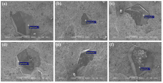 Figure 9 shows the bending fracture morphologies of diamond tools under pre-alloyed powders with different Ni contents. It can be seen from Figure 9a that the fracture of diamond tools contains continuous linear pores with Ni-free in the pre-alloyed powders, which corresponded to a low holding coefficient of the sintered matrix to the diamond and a low bending strength of diamond tools. When the Ni content of pre-alloyed powders increases from 3 to 9 wt.%, the number of linear pores in the fracture of diamond tools decreases, and the structure distribution of the matrix is uniform, thus improving the density of the sintered matrix, enhancing the holding ability of the sintered matrix to the diamond and increasing the bending strength of diamond tools (see Figure 9b–d). The lifetime extension of the diamond tool reaches the optimal value with the Ni content of 9 wt.%. When the Ni content exceeds 9 wt.%, there is some crack at the fracture and the corresponding service life of diamond tools is decreased (see Figure 9e,f).