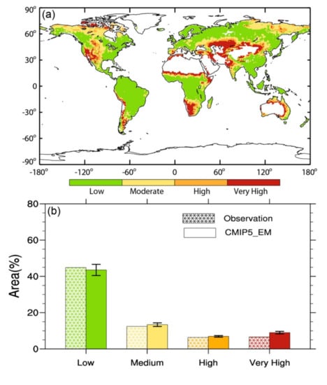 (a) The global desertification risk level distribution from 2000 to 2014, estimated based on the Global Desertification Vulnerability Index; (b) The proportion of areas with different desertification risk levels in the global land area [4].