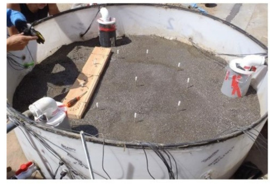 Microbial sand fixation technology is not limited to small-scale laboratory studies but is also applied to large-scale outdoor studies. Figure 5 [23] and Figure 6 [24] are photos of extensive outdoor experiments. Figure 7 [25] is a schematic diagram of the test system. Meng et al. [26] conducted outdoor experiments in Ulan Buh Desert, and the results confirmed that the use of Sporosarcina pasteurii to consolidate desert soil could improve the wind erosion resistance of soil. Outdoor microbial sand fixation experiments need to overcome many difficulties and the cost is relatively high. According to the results of small sand fixation experiments in the laboratory, part of the results of large outdoor experiments can be predicted by using the model [27].