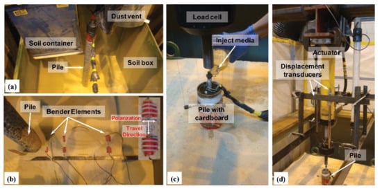 Detailed device drawing for large MICP grouting (a) soil raining; (b) bender element installation; (c) media injected from the top of the pile; (d) pull-out loading setup [24].