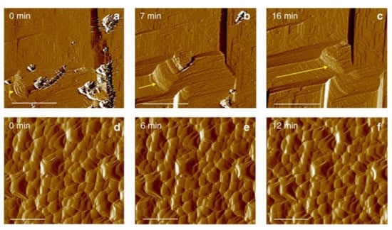 AFM image of the calcite surface over time after exposing the ancient building surface to MgSO4 solution. (a–c) Untreated; (d–f) Indigenous bacteria-treated [89].