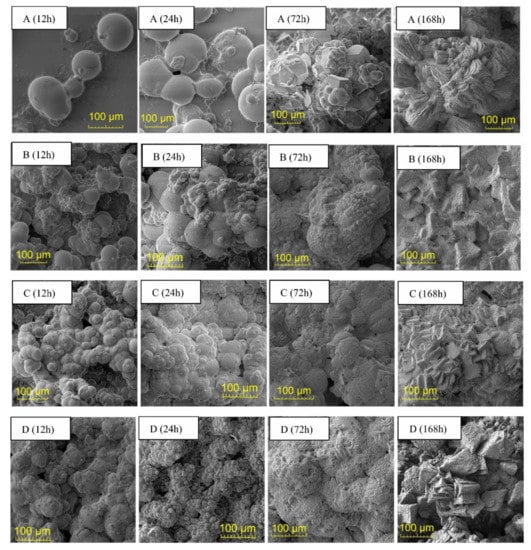 SEM images of CaCO3 treated with different concentrations of bacterial solution. (A) OD600 = 0.1; (B) OD600 = 0.3; (C) OD600 = 0.6; (D) OD600 = 1.0 [136].
