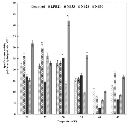 Effect of temperature on urease activity of urease-producing bacteria. Control: S. pasteurii DSM 33; LPB21: closest match Sporosarcina pasteurii fwzy14; NB33: closest match Sporosarcina pasteurii WJ-4; NB28: closest match Sporosarcina pasteurii WJ-5; NB30: closest match Sporosarcina pasteurii fwzy14. Significance level was set to 0.05 (*) [138].