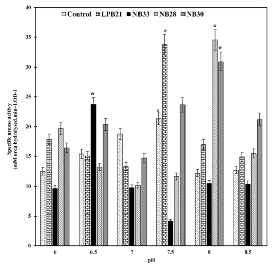 Effect of different initial medium pH on urease activity. Control: S. pasteurii DSM 33; LPB21: closest match Sporosarcina pasteurii fwzy14; NB33: closest match Sporosarcina pasteurii WJ-4; NB28: closest match Sporosarcina pasteurii WJ-5; NB30: closest match Sporosarcina pasteurii fwzy14. Significance level was set to 0.05 (*) [138].