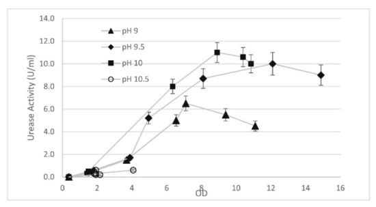 Relationship between urease activity and bacterial concentration under different initial pH mediums [144].