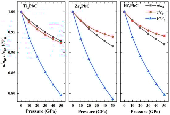 The impact of pressure on lattice parameters is investigated by varying pressure from 0 to 50 GPa with a step of 10 GPa, which is presented in Table S1 and reflected in Figure 2. In terms of the lattice parameters, the unit cell volume decreased with the rise in pressure, while the internal parameter increased for all studied systems. Figure 2 illustrates the effect of pressure on the ratio of equilibrium parameters a/a0, c/c0 and volume V/V0, where a0, c0, and V0 represent the lattice constants and volume at zero pressure. From Figure 2, a reduction in the lattice parameters ratio can be seen with growing pressure. Thus, deviations are observed to be linear interpolation for a/a0 than that of c/c0. It is also observed from Figure 2 that the V/V0 ratio decreases with additional increase in pressure, indicating a strong compressibility. Moreover, the reduction in V/V0 ratio is found to be 20.4%, 21.5% and 25.5% for Ti2PbC, Zr2PbC and Hf2PbC, respectively, with a more significant effect on Zr2PbC. It is worth noting that, at high pressure, the volume proportion bend turns out to be consistent, illustrating that change in atomic distance is more modest, which brings about more grounded shared repulsion as atoms come nearer; in the long run, compression of the structure becomes more difficult. A similar behavior is observed for lattice parameter ratios (a/a0, c/c0).
