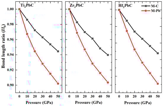 The bond length ratio of M–C and M–Pb atoms of the M2PbC (M = Ti, Zr, Hf) MAX phase unit cell as function of pressure is shown in Figure 3. It is noticed that the bond length is shortened with the increase in pressure. Moreover, the bond length M-Pb becomes stiffer than that of M–C. The bond lengths in Zr2PbC are more reduced compared with those of Ti2PbC and Hf2PbC, indicating further compressibility along the Zr–Pb direction.