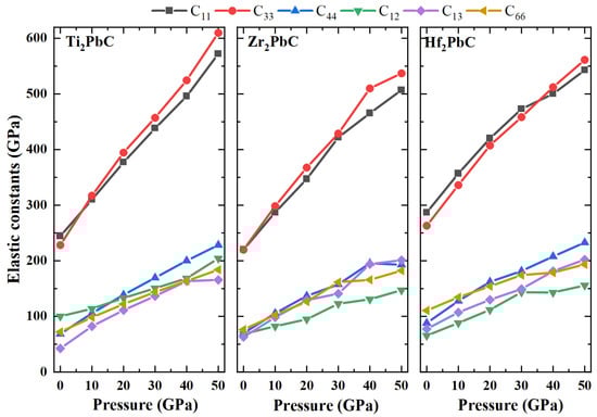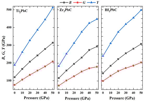 The elastic constants Cij and elastic moduli are studied under pressure varying from 0 to 50 GPa, as shown in Figure 4 and Figure 5. It is observed from the plots that the elastic constants and moduli uniformly increase with pressure increases. Our findings also show that the computed C11, C33, Young’s modulus, and bulk modulus values increase remarkably when compared to other elastic constants, whereas the C66 and shear modulus change more gradually. Note that C44 for the Zr2PbC increases uniformly up to 40 GPa, and further reduces when pressure reaches 50 GPa. It is also noticed that C33 is larger than C11 under pressure, stating that the chemical bonding strength grows significantly with an increase in pressure. It is also shown that an increase in pressure leads to a larger increase in bulk, shear and Young’s moduli for Ti2PbC than that of Zr2PbC and Hf2PbC, indicating a good resistance to deformation for Ti2PbC. This behavior is observed in M2AC (A = Sn, Ga...) compounds [30,35,36]. Based on a substantial experimental dataset assessment, Pugh [47] suggested that G/B values less than 0.571 are correlated with ductility, whereas higher G/B values denote brittleness. As is reported in Table 3, the investigated systems are expected to behave essentially as brittle materials.