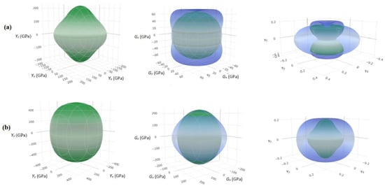 3D plot of Young’s modulus, shear modulus, and Poisson’s ratio surfaces of Hf2PbC at pressure (a) 0 GPa and (b) 100 GPa.