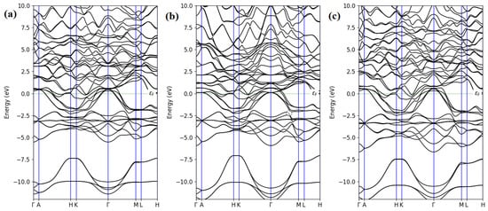 To get a further understanding about the electronic feature, we calculated the band electronic structure at optimized geometry at equilibrium volume by including SOC contribution, as illustrated in Figure 9. It can be evaluated from the energy band structure that no band gap is observed at the Fermi level, in which a large overlapping of occupied and unoccupied states appears. Therefore, the conductivity of studied materials is of metallic electronic nature. It is also observed that a strong anisotropic character is indicated with less c-axis energy dispersion, owing to the decreased dispersion along the short H–K and M–L directions. These findings are highly similar to those obtained for other MAX phase materials [29]. Note that SOC leads to an increased band dispersion and splitting along the investigated high symmetry directions.