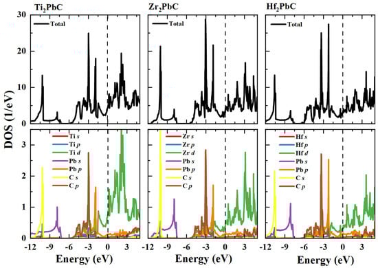 The total densities of states (TDOS) for M2PbC (M = Ti, Zr, Hf). The vertical dotted line represents the Fermi level.