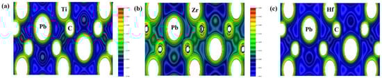 To probe the light of the bonding nature, we calculated the charge densities (Figure 11), mapping in the (11–20) plane for Ti2PbC, Zr2PbC, and Hf2SnC. The charge densities are computed using the full potential (linearized) augmented plane waves, plus the local orbitals (FP-(L) APW + lo) method [52] within the GGA-PBE approximation. The self-consistent procedure was performed with RMT × Kmax = 11. The plots show that metallic bonding is illustrated in M and Pb layers, while no free charge density distribution in C planes is noticed. In the plane, the charge density distribution reports detailed features on the interaction between different atoms. The interaction between M and C atoms in M2PbC indicates covalent bonds, showing a very strong bonding. Simultaneously, the more electronegative character of C contrasted with Ti, Zr or Hf gives the presence of ionic bonding between Ti, Zr or Hf and C, whereas the more electropositive description of Pb affirms the ionic character between M and Pb. Thus, the bonding nature in M2PbC is found to be a mixture of metallic–covalent–ionic behavior. It can be concluded that large melting points and modulus are anticipated from the strong existence of covalent and ionic bonding, whilst microscale plasticity and good electrical conductivity are expected from the presence of the metallic nature [53,54].