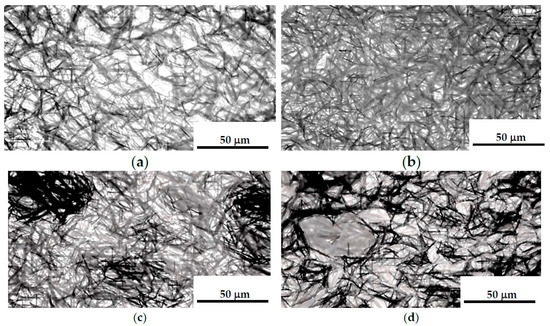 Optical micrographs of sintered Cu-Zn GNSs nanocomposites: (a) Cu-Zn 5 wt.% + Graphene 1 wt.%; (b) Cu-Zn 10 wt.% + Graphene 1 wt.%; (c) Cu-Zn 15 wt.% + Graphene 1 wt.%; and (d) Cu-Zn 20 wt.% + Graphene 1 wt.%.