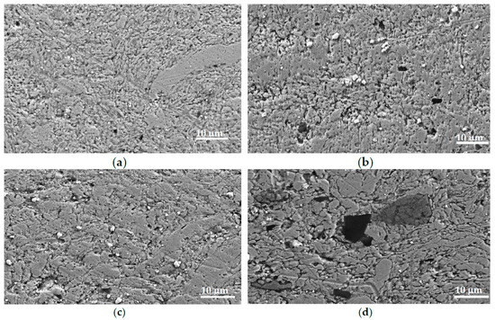 SEM of sintered Cu-Zn GNSs composites: (a) Zn 5 wt.%, (b) Zn 10 wt.%, (c) Zn 15 wt.%, and (d) Zn 20 wt.%.