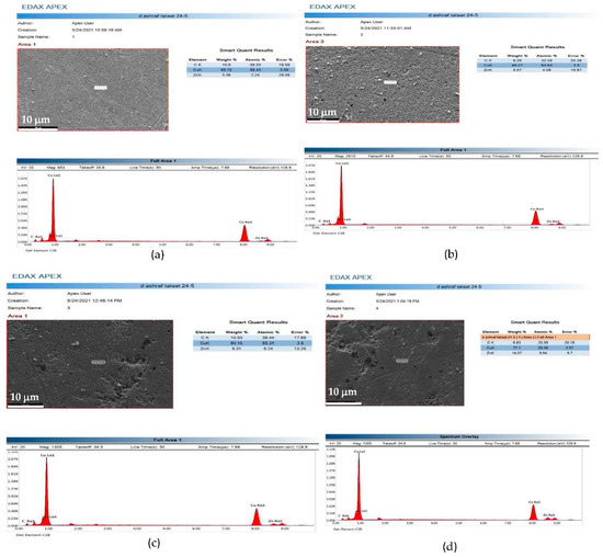 EDX of sintered composite samples: (a) Cu94Zn5GNSs1, (b) Cu89Zn10GNSs1, (c) Cu84Zn15GNSs1, and (d) Cu79Zn20GNSs1.