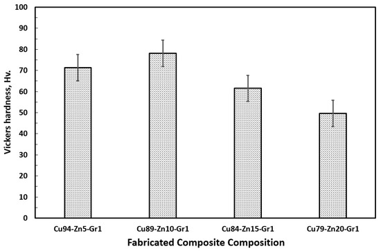Figure 8 presented the effect of Zn additions on Vickers hardness values of Cu matrix reinforced with 1 wt.% GNSs. The Figure demonstrated that the hardness of all prepared samples was higher than that of pure annealed Cu (40 Hv). As such, reinforcing Cu with 1 wt.% GNSs and Zn metal improved the hardness of Cu up to 78.1 Hv for 10 wt.% Zn sample. This may be attributed to the high strength of GNSs, which dispersed homogeneously on the Cu matrix. GNSs had superior properties, such as being super-flexible, super-strong, super-light, and super-thin. Owing to all these extraordinary properties, reinforcing any ductile metal with GNSs improved its mechanical properties, especially hardness. GNSs were the hardest material known, until now. It had a tensile strength of 130 GPa, and as such, the addition of GNSs to Cu-Zn alloy enhanced the microhardness. A Zn sample has the highest hardness with a 10 wt.%, possibly attributed to its highest density and more uniform microstructure. Although the hardness of 15 and 20 wt.% Zn was decreased, it was still higher than that of pure Cu. This could be attributed to reinforcing Cu with a hard ceramic GNSs and Zn metal that formed a solid solution that gave strength to the samples [21].