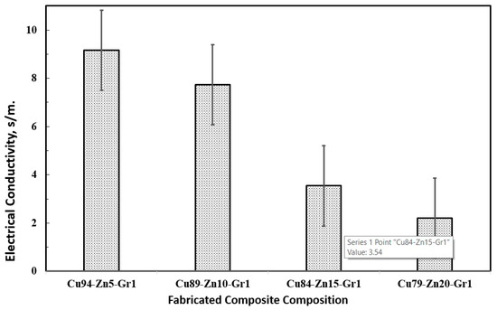 Figure 10 showed the effect of Zn additions and graphene nanosheets on the electrical conductivity of Cu-Zn-GNSs composites. A gradual decrease in the electrical conductivity occurred by increasing Zn percentages. This could be attributed to the lower electrical conductivity value of Zn than that of Cu (1.63 × 107 and 5.96 × 107 s/m for Zn and Cu, respectively). The incorporation of low conductive particles with low free electrons to a conductive matrix restricted the electron motion and decreased the conductivity value. However, although the conductivity of Cu-Zn GNSs composites decreased, the 5 and 10 wt.% Zn samples had a high conductivity value, which was already in the application ranges of Cu. Furthermore, the presence of GNSs helped in enhancing the electrical conductivity of the prepared samples.