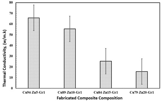 Figure 11 showed the effect of Zn additions on the thermal conductivity of Cu-Zn GNSs composites. The Figure showed gradual decreases in the thermal conductivity by Zn increment. This could be attributed to more than one reason; the first is a decreased thermal conductivity value of Zn than that of Cu, which was 401 (w/m·k) for Cu and 116 (w/m·k) for Zn. As such, the presence of Zn particles with low thermal conductivity decreased the conductivity of the prepared samples [23]. The second reason was the formation of pores by the addition of Zn and GNSs, which also had a negative effect on the thermal conductivity as the conductivity of any pore is zero, which restricted the heat carrier mobility.
