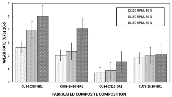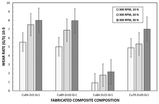 Figure 12, Figure 13 and Figure 14 showed the effects of Zn additions, applied load, and milling speed on the wear rate of the manufactured Cu-Zn GNSs composites. From Figure 12, Figure 13 and Figure 14, it was clear that as the applied load increased, the wear rate increased, and by increasing the milling speed (rpm), the wear rate also increased. This could be explained by the fact that the contact area between the pin and the sample’s surface increased, giving the pin more chance to wear more area from the contact surface, and consequently, the wear rate increased [24]. By increasing the rpm, the increased wear rate could be explained by the fact which stated that increasing (rpm) led to an increase in the frictional track on the sample’s surface that increases the grooves and wear rate [25]. Another phenomenon from the wear rate figures could be observed: the decreased wear rate from increasing the zinc ratio up to the 15 wt.% that recorded the lowest wear rate value, then increased for the 20 wt.% sample. This was for both the 150 and the 450 rpm groups for the three applied loads (10, 20, and 30 N). This could be explained by the addition of a ceramic or lubricant material, such as the kind GNSs gives to increase strength to the ductile Cu with its good distribution [19,26]. Furthermore, low density (2.2 g/cc) caused the collection of it on the sample’s surface, increasing the sliding of the pin on the surface, consequently decreasing the wear rate. The presence of GNSs caused the formation of tribo-layer on the sample’s surface that decreased the wear rate. For the 20 wt.% Zn sample, some agglomerations of GNSs occurred that increased the porosity, which consequently caused the wear rate to increase. Zinc formed a solid solution with Cu and provided more strength by forming an alloy that resisted wear and corrosion. However, for 300 rpm, the wear rate decreased by increasing the Zn percentage gradually to 20 wt.% Zn sample, which recorded the lowest wear rate [27].