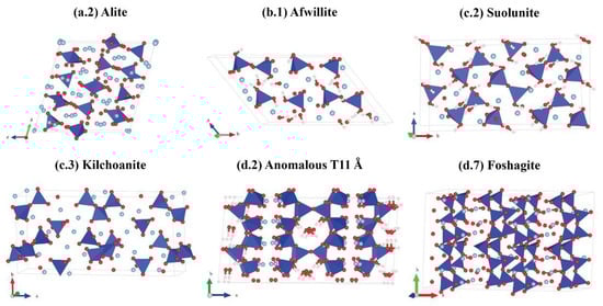 Crystals structures of C-S-H and C-S crystal: (a.2) Alites; (b.1) Afwillites; (c.2) Suolunites; (c.3) Kilchoanites; (d.2) Anomalous T11 Å; (d.7) Foshagites [27].