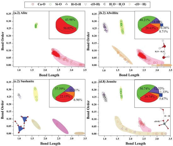 Distributions of bond orders and bond length for (a.2) Allites; (b.2) Alwillites; (c.2) Suolunites; and (d.8) Jennites. Cryptograms of bonds include “-” for covalent bonds, “…” for HBs. In the inserts, the pie charts show percentages of different bonding types: blue hydrogen bonds between water molecules; orange, other hydrogen bonds (HBs); violet, covalent –(O-H); green, Si-O; and red, Ca-O. Different hydrogen bond types are shown by lower insets [6].