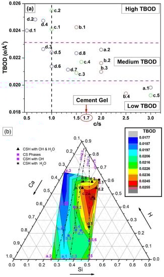 Total bond order density vs. the C/S ratios, showing estimated indirect relationships, are indicated in Figure 3a. It is clear that crystals can have different total bond order density even if they have the same C/S ratios. The use of total bond order density for classifications of C-S-H crystals is most relevant because the total bond order density is more relevant to cohesion and sensitive to the bonding. Moreover, these plots show that the four classes explained above do not cluster together regarding the total bond order density. Class (c) has a wider range of total bond order densities and C/S. Nevertheless, the class has narrower distributions in C/S but a wide total bond order density range. Group (d) is thought to be closest to hydrated cements. Generally speaking, the twenty crystals can be categorized into three classes (low, medium, and high) according to their total bond order density. In particular, due to the high C/S ratios, crystals of c.5, a.1, and b.4 belong to the low total bond order density class.