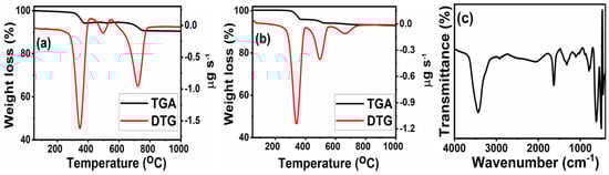 TGA-DTG curves of: (a,b) LZ-s and LNZ-s by the solid-state route; and (c) FT-IR spectrum of LZN-s after thermal degradation.