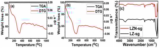 TGA-DTG curves of (a,b) LZ-sg and LNZ-sg by the sol-gel route; and (c) FT-IR spectra after thermal degradation.