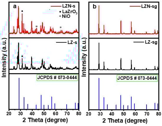 The powder XRD was used to recognize the phase purity and crystalline structure of the fabricated La2Zr2-xNixO7, depicted in Figure 3. The XRD patterns of LZ-s and the LZN-s pyrochlores fabricated by the solid method are shown in Figure 3a. It was observed that the peaks corresponding to the base pyrochlore cubic structure, instead of the fluorite phase, were detected in both samples. However, other phases also segregated, such as the perovskite phase (LaZrO3) and the NiO phase, in addition to the cubic phase [6]. The peaks of the (200) and (220) NiO phases, at 2θ values of 43.4° and 63.05°, respectively, were observed in the LZN-s sample. The (200) plane of NiO coincides with the low-intensity (511) plane of the pyrochlore [7]. This divulges that the chosen temperature and decomposition time (6 h and 1200 °C) were insufficient to grow into the pyrochlore structure; it needed more heat and time for the complete transformation.